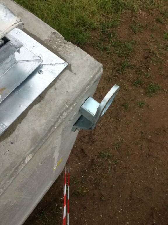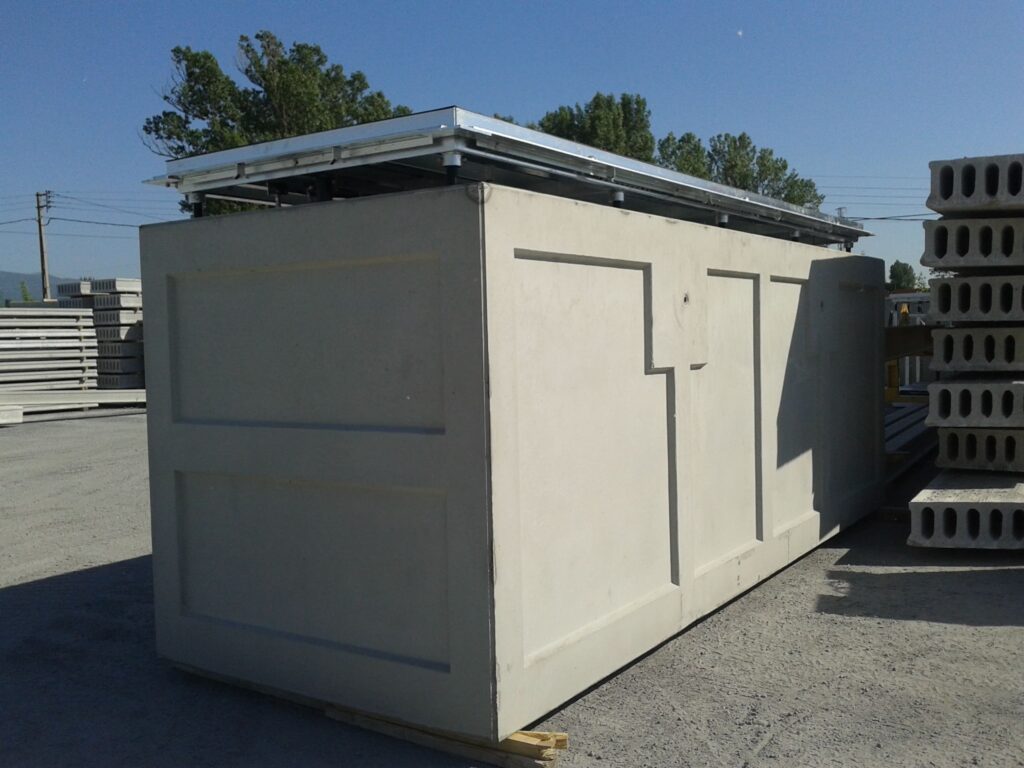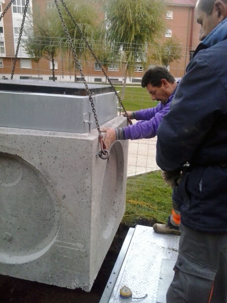 Cubeto prefabricado de hormigón. El conjunto se completa con una serie de planchas de acero galvanizado para realizar el cerramiento entre la parte superior del prefabricado y el límite inferior del marco del equipo. De esta manera la obra civil a realizar por el cliente se reduce a: Excavación, nivelación con gravas, trasdós con gravas y acabado superficial. Previo a la descarga del cubeto, el cliente deberá haber compactado y nivelado la excavación practicada siguiendo nuestras instrucciones.